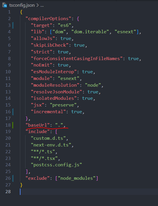 분명히 tsconfig.json을 baseUrl: "."으로 적용했는데 적용이 안되는 이슈가 있었다. 폴더구조가 복잡해져서 절대 경로를 꼭 사용하고 싶었는데 안돼서 찾아보던 도중 문제를 발견했다. 후.....