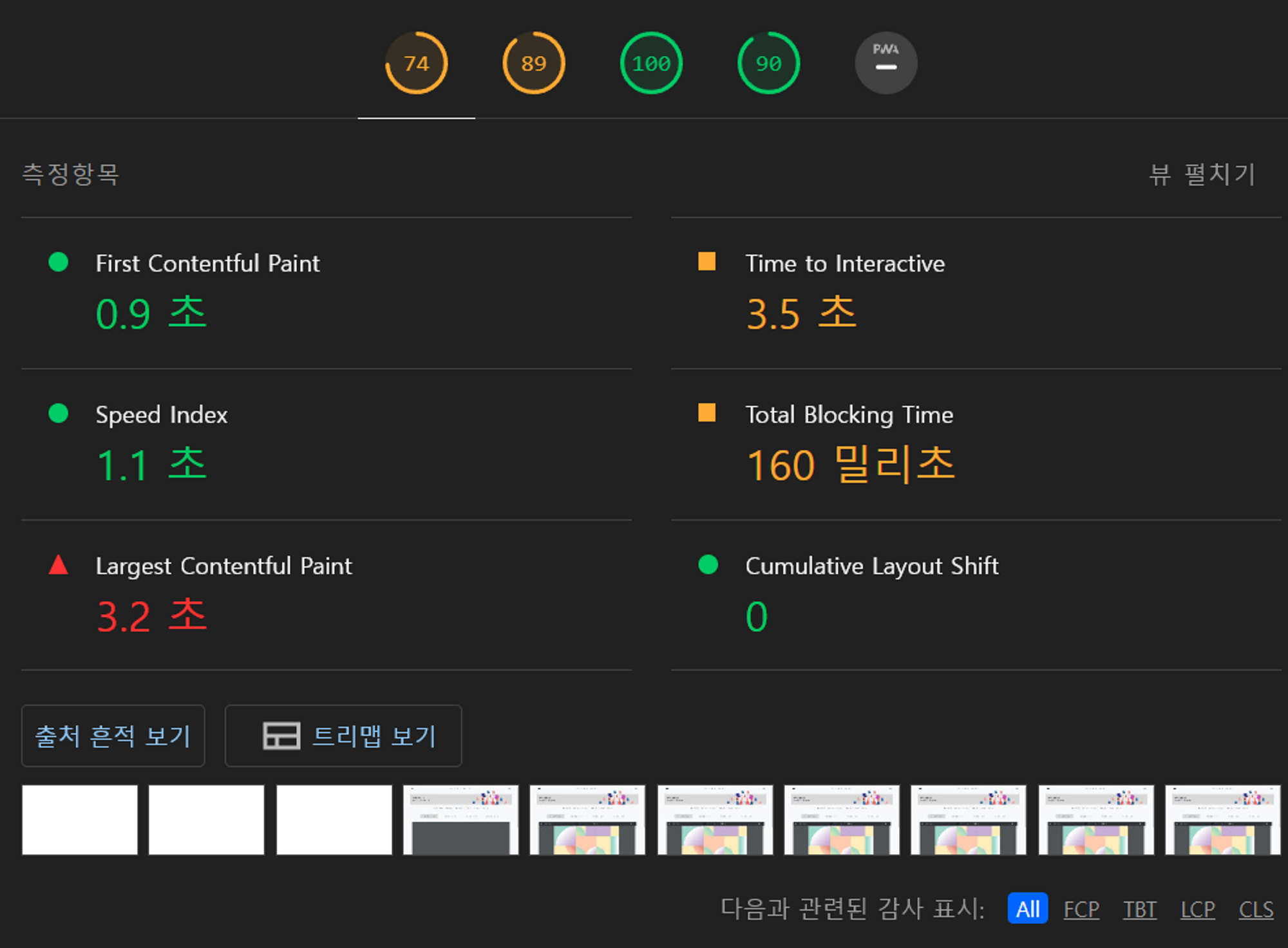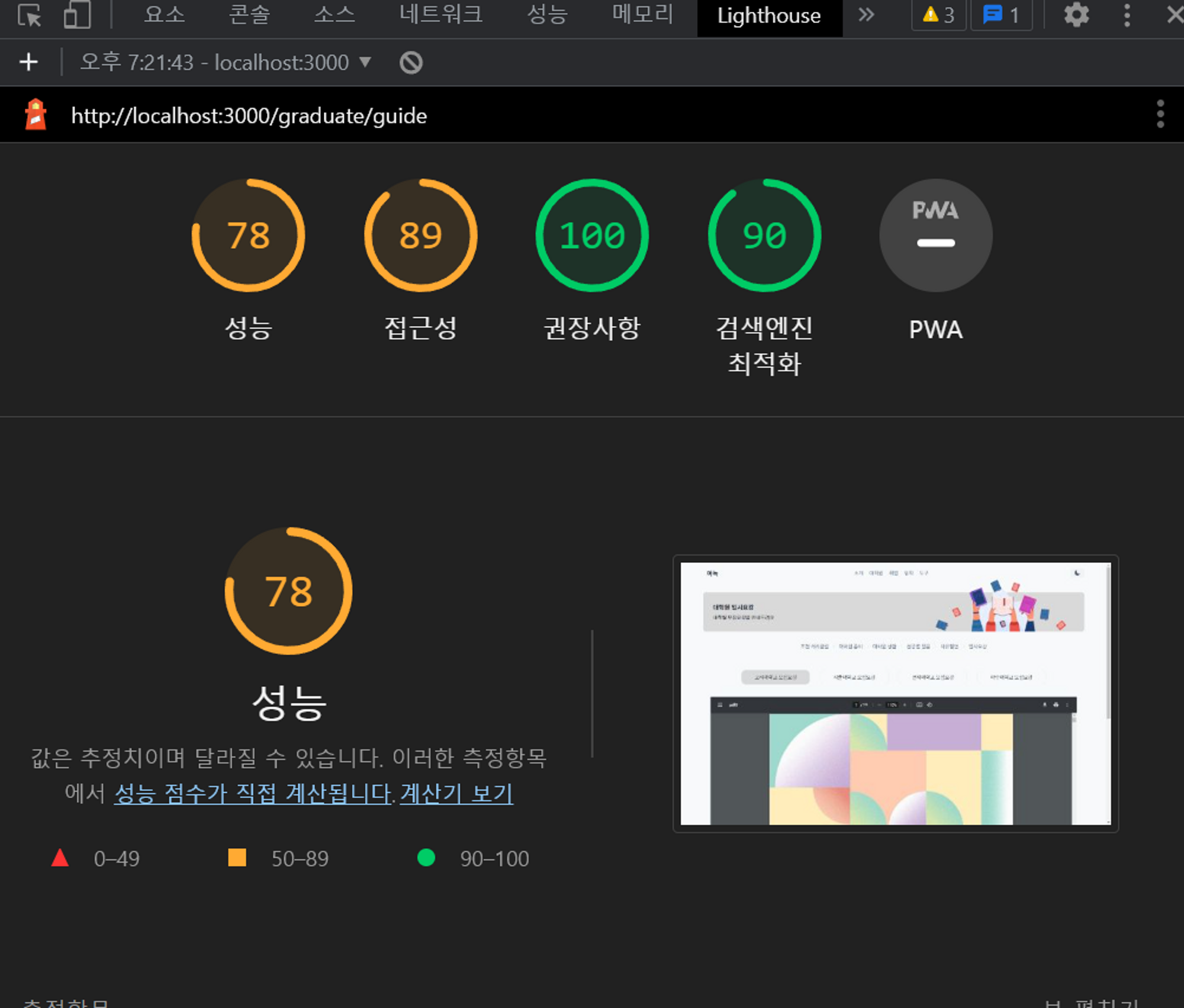 전체적인 성능은 비슷했지만 embed의 Speed Index가 0.5초 정도 더 빠른 것을 볼 수 있었다. 대학원 입시요강 페이지는 탭을 선택했을 때 해당하는 대학별 입시요강 pdf를 보여주는 것이 목적이기 때문에, 주 콘텐츠인 pdf 파일이 빨리 보이는 게 중요하다고 생각해서 embed로 PDF Viewer를 구현했다.