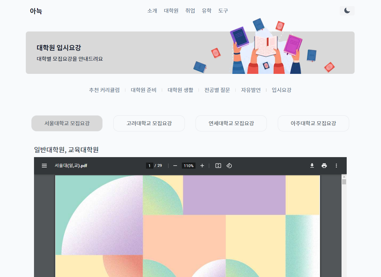 아늑 프로젝트에서 대학원 입시요강을 PDF 뷰어로 웹상에서 볼 수 있도록 구현해야 했다. 처음에는 Next.js에서 API 동적 라우팅을 통해 해당하는 PDF를 불러오도록 했다. 여기서 발생한 문제는 일반대학원, 교육대학원으로 2개의 pdf를 불러와야 하는 경우가 있다는 점이었다. 실제 배포해서 사용할 수 있는 서비스를 구현하고 있다 보니 로딩 속도가 가장 주된 관심사였다. 그래서 머릿 속에서만 고민하지 말고 실제로 비교해보고자 했다! 결과적으로는 embed 태그로 바로 불러왔다.